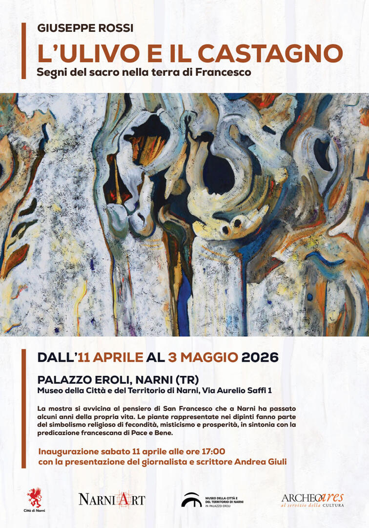 L’esposizione, intitolata “L’ulivo e il castagno. Segni del Sacro nella terra di Francesco” di Giuseppe Rossi  e organizzata da Archeoares, capofila dell’ati NarniArt, con il patrocinio del Comune di Narni, verrà inaugurata sabato 11 aprile alle ore 17 con la presentazione del giornalista e scrittore Andrea Giuli e sarà visitabile fino al 3 maggio.