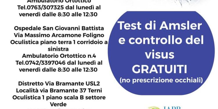 Nella giornata di giovedì 9 ottobre, sarà possibile effettuare gratuitamente, presso le strutture della USL Umbria2 dalle ore 8 alle 13, test di Amsler utile per rilevare anomalie nella visione centrale, in particolare legate alla maculopatia, e controllo del visus (senza prescrizioni di occhiali).