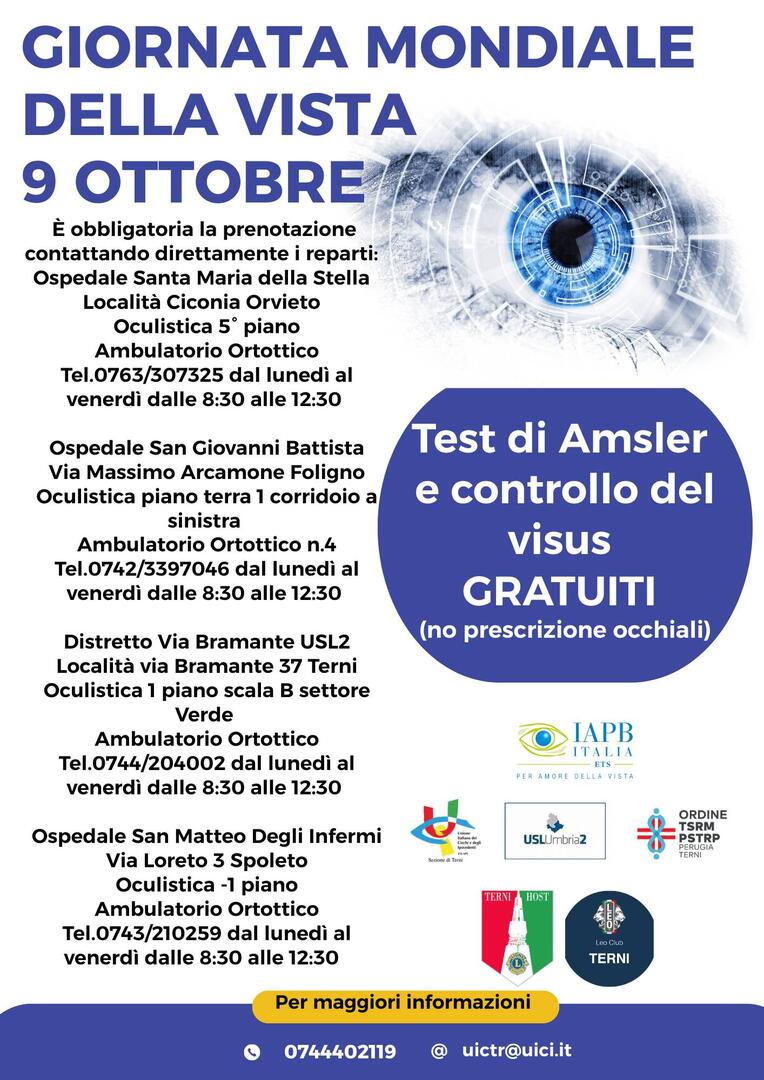 Nella stessa giornata la sezione ternana Uici si dedicherà alla distribuzione di materiale informativo per le vie principali della città e sarà organizzata una conferenza stampa nella sede Uici di via Faustini 22 alle ore 11.30 con la partecipazione di Luciano Burattini oculista facente funzione primario della struttura complessa Foligno-Spoleto, Annarita Bastianini coordinatrice del servizio ortottico dell’Usl e Daniele Maccaglia presidente dell’Uici di Terni.