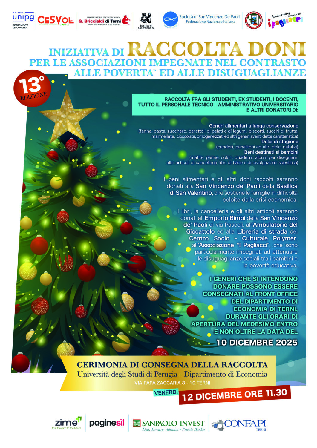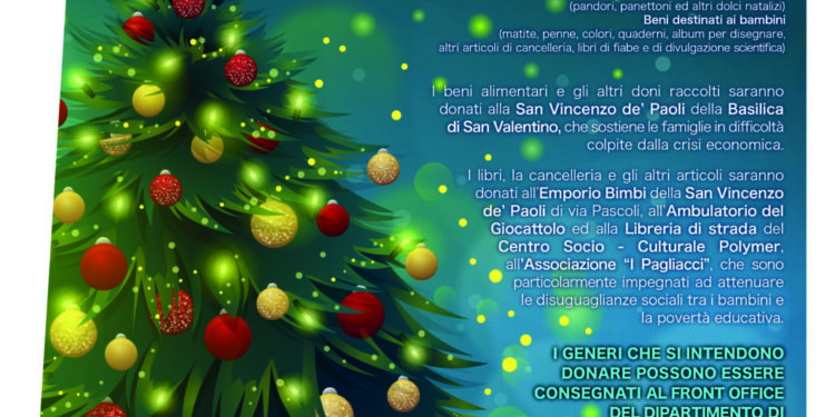La sede di Terni del dipartimento di economia dell’università degli studi di Perugia, il Cesvol Umbria sede di Terni, la San Vincenzo de’ Paoli della basilica di San Valentino di Terni, l’Ambulatorio del giocattolo e la Libreria di strada del centro sociale Polymer, l’associazione “I Pagliacci”, l’Emporio bimbi di Terni con altre realtà associative ed imprenditoriali del territorio, promuovono la raccolta di generi alimentari a lunga conservazione e dolci natalizi, materiale di cancelleria e libri di fiabe a sostegno delle persone bisognose ed una raccolta di beni destinati ai bambini.