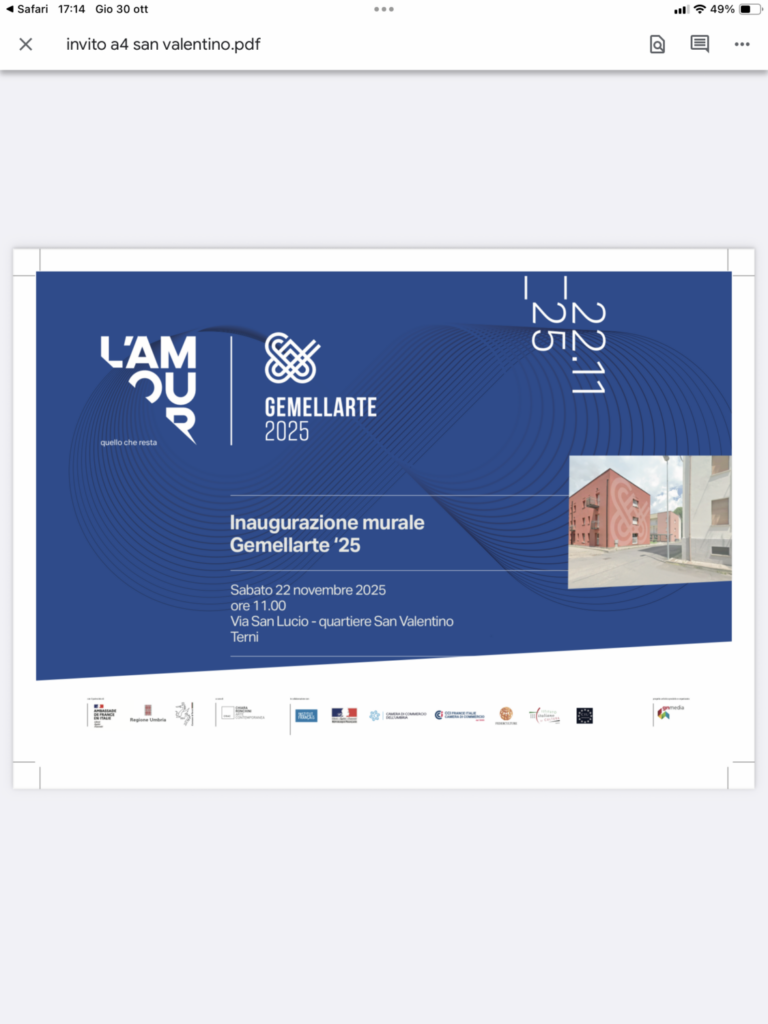 A Terni la residenza avrà luogo in via San Lucio, nel quartiere San Valentino, oggetto di un’importante riqualificazione da parte del Comune di Terni, che verrà così completata e coronata da un’opera d’arte donata dal Festival GemellArte. A spiegare l’importanza della sede scelta per l’intervento su Terni è l’assessora alla cultura del Comune di Terni Michela Bordoni: “GemellArte nel tempo si è confermato come uno dei progetti più significativi per la nostra città: un ponte tra culture, un dialogo tra artisti e cittadini, ma soprattutto un’occasione per far nascere bellezza nei luoghi che più hanno bisogno di sentirsi parte di una comunità viva. La scelta di San
