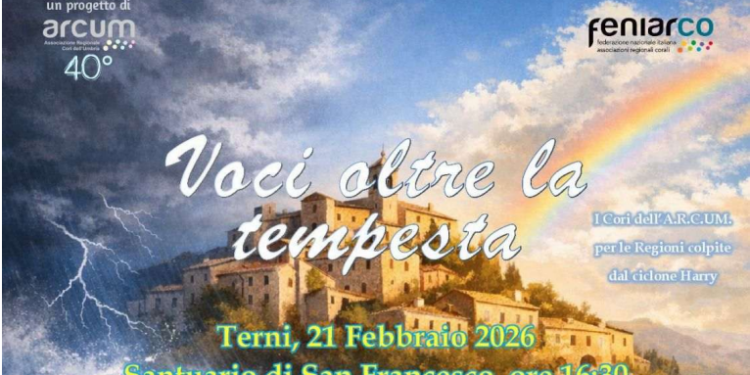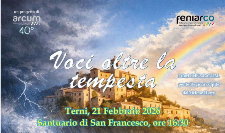 “VOCI OLTRE LA TEMPESTA” è la rassegna corale,  a scopo benefico,  promossa dall’ASSOCIAZIONE REGIONALE CORI DELL’UMBRIA A.R.C.UM che da venerdì 20 febbraio  a domenica 22 febbraio coinvolgerà 18 cori dell’Umbria in 6 eventi musicali in varie città della regione con l’obiettivo di raccogliere fondi a favore delle regioni colpite dal ciclone Harry.