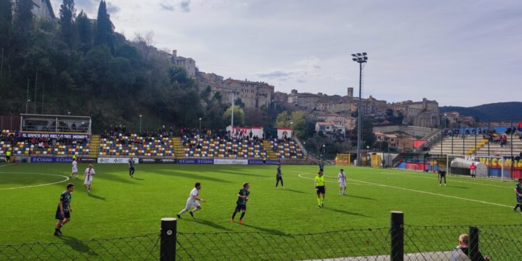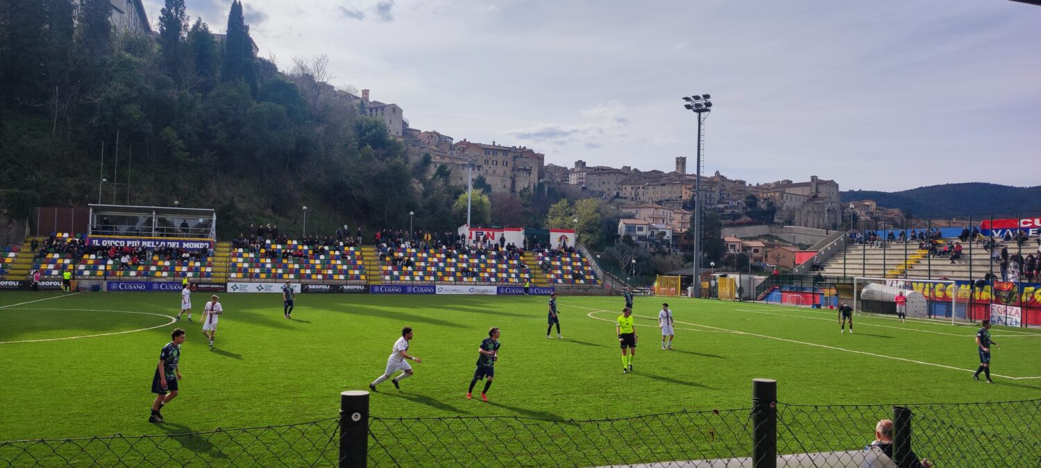 La salvezza diretta è ora a cinque punti a cinque giornate dalla fine. Ecco il calendario: trasferta a Santa Maria degli Angeli (proibitiva), poi scontrissimo col Santa Sabina (da vincere assolutamente), viaggio a Terni contro la Thyrus (con qualche possibilità di vittoria), dopo a Bastia contro gli acerrimi nemici, e l’ultima contro il Pierantonio, uno squadrone. Una cosa complicata ma che si può ancora rappezzare a patto che giochi con la forza di stasera e poi segni almeno i rigori.
