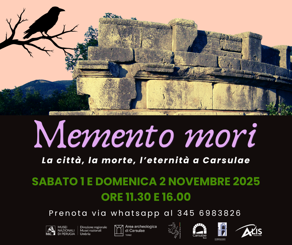 Nel fine settimana del 1 e 2 novembre l’area archeologica di Carsulae ospita la visita speciale “Memento Mori. La città, la morte, l’eternità a Carsulae”, un percorso guidato tra i monumenti della città romana che approfondisce il tema dell’aldilà nel mondo antico, con particolare attenzione ai riti funerari, ai culti legati al ricordo e al valore della memoria degli avi nella società romana.