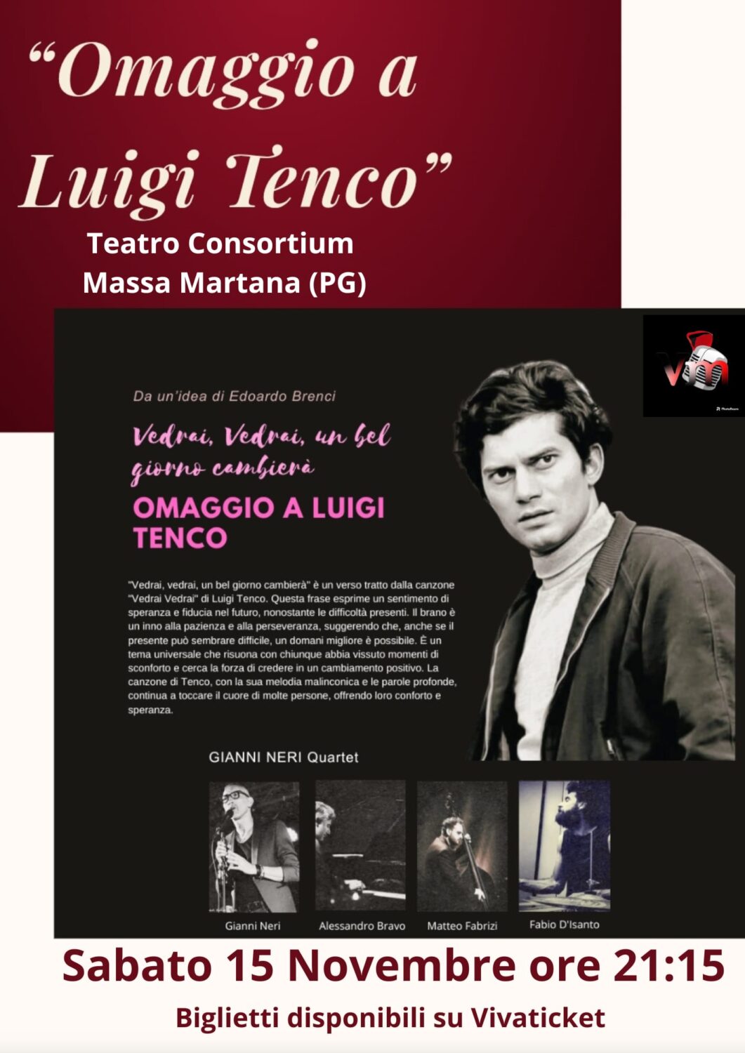 Penultimo appuntamento con TEATRO VIVO al teatro Consortium di Massa Martana dove Magazzini Artistici, che organizza la stagione con il patrocinio e la collaborazione dell’assessorato comunale alla cultura, propone uno spettacolo dal sapore particolare e dal grande fascino. “Vedrai, vedrai, un bel giorno cambierà. Omaggio a Luigi Tenco” con il Gianni Neri Quartet di Terni, da un’idea di Edoardo Brenci, in scena sabato 15 novembre alle 21,15.
