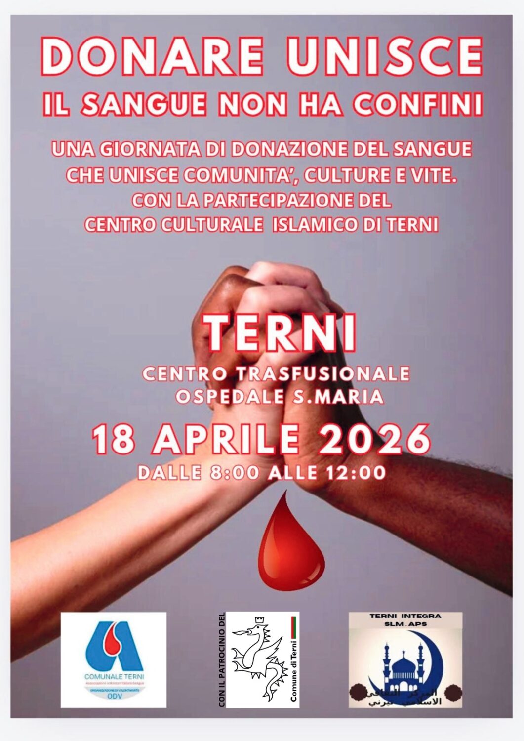 La data del 18 Aprile 2026 sarà la prima di una serie di iniziative mirate a creare una maggiore integrazione tra comunità. La solidarietà diventa un incontro per portare nuovi donatori ed incrementare il numero di sangue a disposizione dell’ospedale di Terni che ad oggi riesce a coprire appena il 50% del fabbisogno. “Donare sangue è un atto di responsabilità ma anche un segno concreto di comunità. Facciamolo insieme. Donare unisce e il sangue non ha confini. C’è qualcosa che ci unisce tutti, al di là delle differenze. Non la lingua, non la cultura, non la religione.. il sangue.” L’Evento è patrocinato dal Comune di Terni, interverranno Sergio Commissari presidente avis comunale di Terni, Leonardo Mariani presidente avis provinciale di Terni, Francesco Pileri consigliere avis provinciale di Terni e coordinatore evento e Jamghili El Hassan Presidente associazione Terni Integra slm.aps