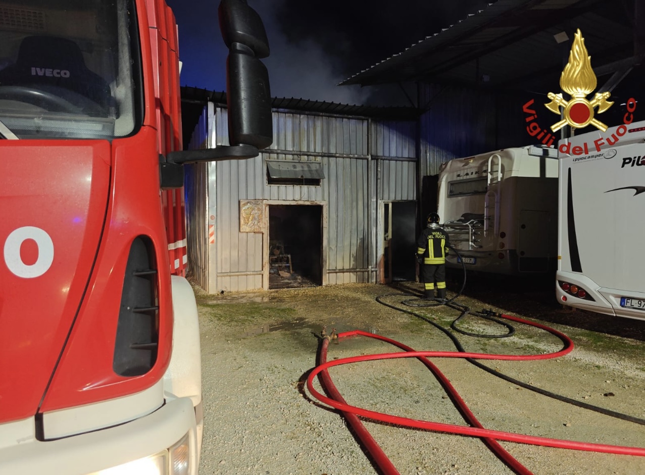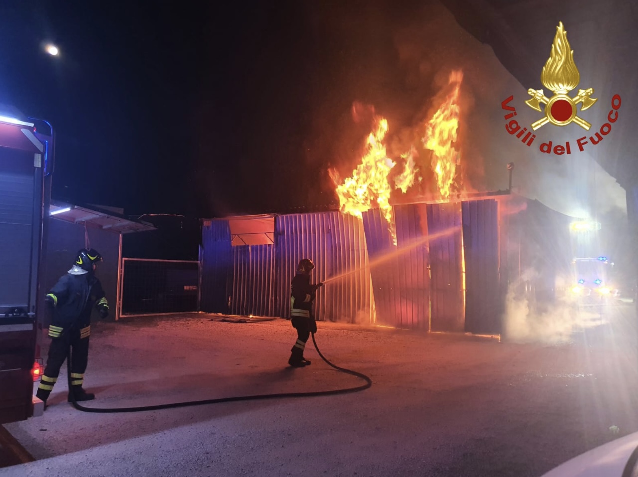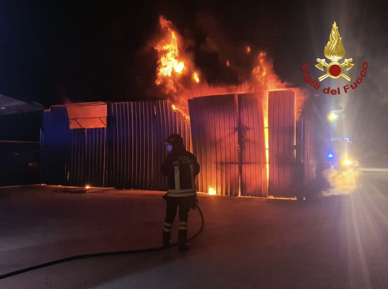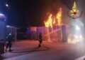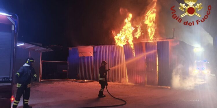 In fiamme un capannone adibito ad officina con all’interno un camper, due macchine operatrici, attrezzature oltre a fusti di olio e lubrificanti altamente infiammabili.