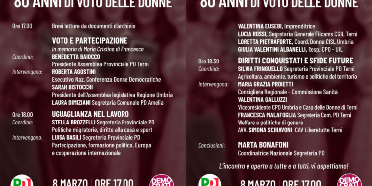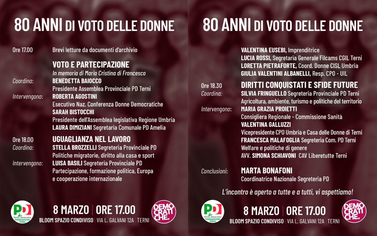 L’8 marzo, festa della donna, vedrà al Bloom spazio condiviso in via Galvani dallle ore 17 un convegno incentrato sugli 80 anni di voto delle donne. Brevi letture da documenti d’archivio, dal voto e partecipazione all’uguaglianza nel lavoro fino ai diritti conquistati e sfide future. L’incontro diviso in tre parti sarà moderato da Benedetta Baiocco, presidente dell’assemblea provinciale Pd di Terni, Stella Brozzelli e Silvia Fringuello della segreteria provinciale Pd Terni. Interverranno la presidente dell’Assemblea legislativa regione Umbria Sarah Bistocchi e la consigliera regionale, commissione sanità Maria Grazia Proietti. La prima parte dell’iniziativa sarà dedicata alla memoria di Maria Cristina Di Francesco, donna tenace e militante appassionata per la salvaguardia dei valori sociali e per il rispetto delle donne. Le conclusioni saranno affidate alla coordinatrice nazionale segreteria Pd Marta Bonafoni.