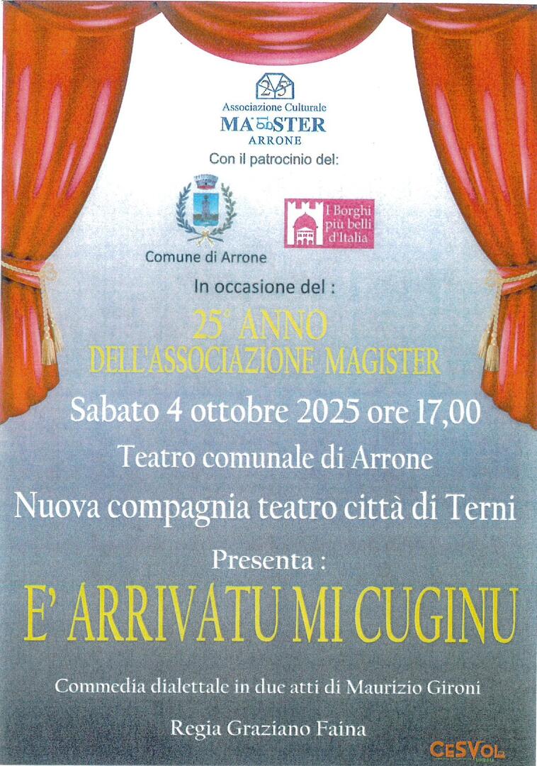 L’associazione culturale Magister di Arrone compie 25 anni e festeggia con un evento che si terrà sabato 4 ottobre, alle ore 17, al teatro comunale di Arrone.
