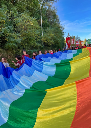La marcia della pace PerugiAssisi è  coloratissima e partecipatissima come mai  e si snoda  con in testa lo striscione “Fraternità”.