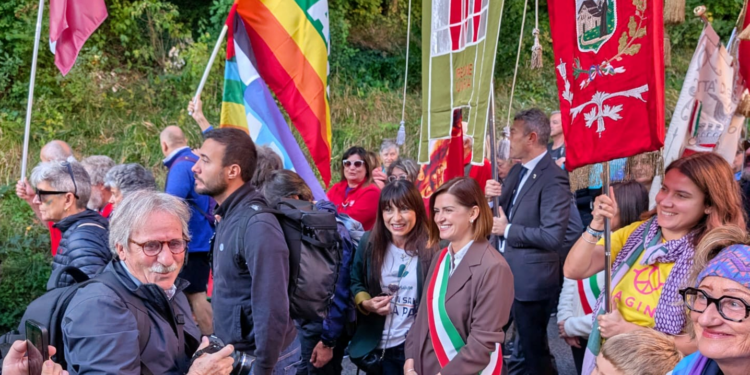 Dal palco allestito subito fuori da Porta San Girolamo, a Perugia ad accogliere le prime fila della folla  per   i 24 km del percorso che ha attraversato Ponte San Giovanni, Bastia Umbra, Santa Maria degli Angeli, per arrivare ad Assisi, dove si è tenuto un momento collettivo di riflessione e festa, tra i gonfaloni del Comune di Perugia e dei Comuni che da tutta l’Italia hanno aderito alla marcia, sono stati la sindaca di Perugia, Vittoria Ferdinandi, il presidente della Provincia di Perugia, Massimiliano Presciutti, e la presidente della Regione Stefania Proietti