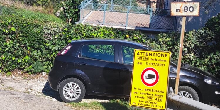 Poi incurante che quella è sicuramente la strada di Santo Pietro, sul segnale qualcuno ha scritto che l’interruzione è in Località Brusciana (????) ed è conseguente alla apertura di una nuova strada, la Srt 429, quella che garantirà l’accesso alla strada di Grande Comunicazione Firenze – Pisa – Livorno.