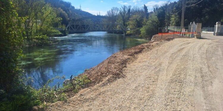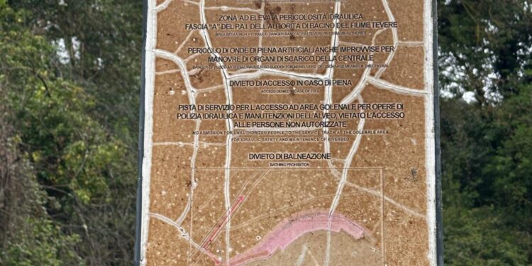 “Pista di servizio per l’accesso ad area golenale per opere di polizia idraulica e manutenzione dell’alveo. Vietato l’accesso alle persone non autorizzate.”