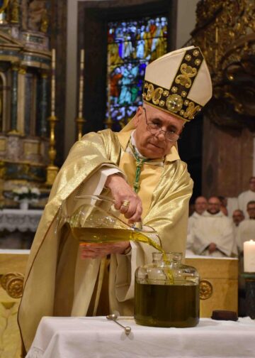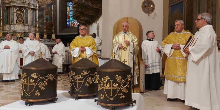 Il vescovo ha benedetto gli oli sacri che saranno usati nell’amministrare i sacramenti: l’olio dei catecumeni col quale sono unti coloro che vengono battezzati; del crisma, una mistura di olio e essenze profumate usata nel battesimo, nella cresima, nella ordinazione di sacerdoti e vescovi, nella dedicazione delle chiese; l’olio degli infermi, che viene utilizzato per dare conforto ai malati e per accompagnare all’incontro col Padre, i moribondi. L’olio è stato donato dalle parrocchie di Santa Maria Regina e Nostra Signora di Fatima dove svolgono il ministero i due seminaristi prossimi diaconi, Mariano De Persio e Matteo Bergonzini, insieme a quello proveniente dal “Giardino della memoria” di Capaci, donato ogni anno alla diocesi dalla Polizia di Stato, mentre l’essenza del bergamotto, con cui vengono profumati gli oli, è stata donata dalla Diocesi di Locri-Gerace in segno di comunione con tutte le Diocesi italiane.