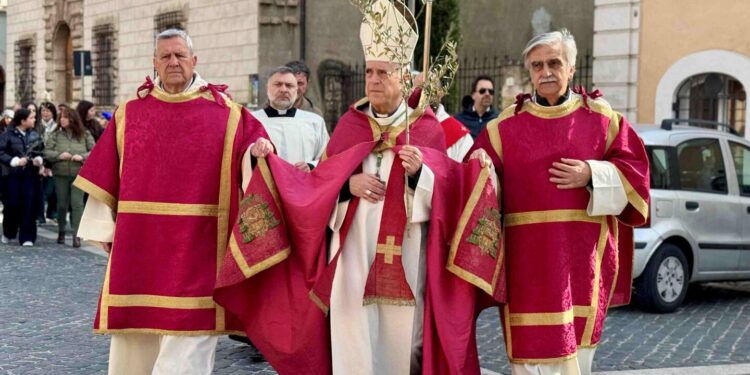 L’amministratore apostolico, mons. Francesco Antonio Soddu ha presieduto la liturgia di domenica 29 marzo con il rito della benedizione dei rami d’ulivo sul sagrato della chiesa di Santa Croce e la lettura del brano del Vangelo dell’ingresso di Gesù a Gerusalemme. Tantissimi fedeli in processioneR con i rami di ulivo benedetti in mano, bambini e ragazzi delle parrocchie della Cattedrale, Santa Croce e San Salvatore e le loro famiglie, hanno raggiunto la Cattedrale, dove la liturgia è proseguita con la lettura della Passione di Cristo dal Vangelo di Matteo, e la celebrazione eucaristica. Hanno concelebrato il vicario generale della Diocesi mons. Salvatore Ferdinandi, il parroco della cattedrale don Alessandro Rossini, il parroco di Santa Croce don Roberto Cherubini, don Camillo Camozzi. I canti liturgici sono stati eseguiti dalla corale polifonica del Duomo diretta da Rita Tomassoni accompagnata all’organo dal maestro Simone Maccaglia.