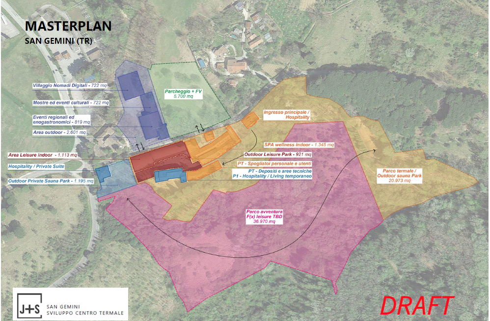Il progetto mira alla ristrutturazione e riqualificazione del complesso situato all’interno del Parco della Fonte. Piano di lavoro teso a valorizzare il territorio regionale, creando occupazione e rilanciando l’intera area di riferimento la quale si presenta in una posizione estremamente favorevole, in quanto si trova a pochi chilometri dalle due provincie della Regione Umbria, Terni e Perugia. La volontà è quella di perseguire l’obiettivo realizzando un servizio termale e wellbeing atto ad attrarre turismo. Fondamentale sarà l’interlocuzione con la Regione Umbria. La proposta progettuale che interesserà il Parco della Fonte di San Gemini prevede aree indoor e outdoor, vasche, strutture spa/wellness, un parco avventura ed anche un villaggio dedicato ai ‘nomadi digitali’ che chiedono solo di avere una connessione internet. L’Umbria con la realizzazione a San Gemini del Centro termale a San Gemini potrebbe incrementare il flusso di turisti.