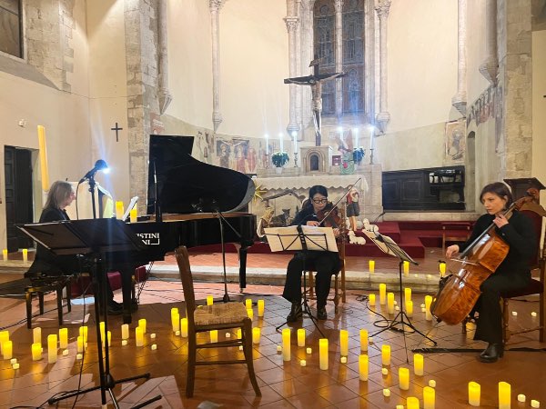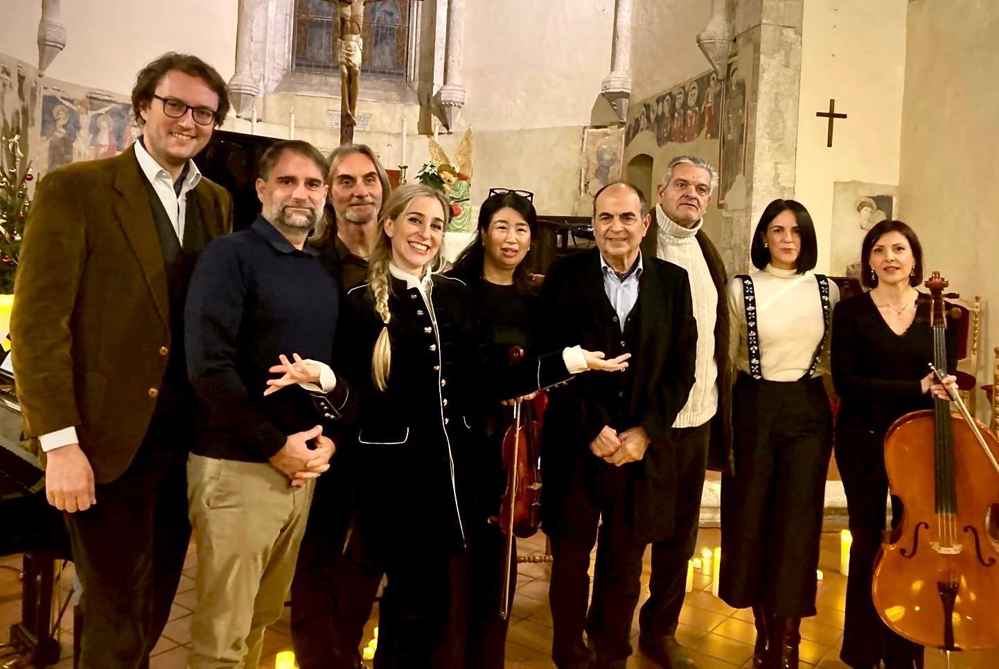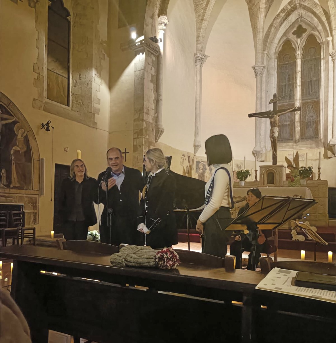 La Chiesa di S. Francesco di Sangemini era gremita di persone per ascoltare Francesco Morettini e la sua ” Sensofonia. Con lui al pianoforte, anche Harumo Ota al violino e Paola Trapè al violoncello, tre artisti che sono stati applauditi a scena aperta per la loro bravura e per la loro interpretazione dei brani che lo stesso Morettini ha composto. Il clou del concerto, tenutosi la sera del 28 dicembre, si è manifestato con l’entrata in scena di Valentina Volpe Andreazza, mezzo soprano, che è stata con la sua meravigliosa voce protagonista insieme ai suoi compagni di viaggio anche in una tournée che ha riscosso un grande successo in Cina, raccontata tra un brano e l’altro. Nel programma musicale proposto oltre ai brani composti dal musicista ternano, noto anche per aver scritto canzoni, tra gli altri, per Mina, Stadio, Zero, Amoroso, anche due dolcissime composizioni cinesi e in conclusione il celeberrimo ” Nel blu dipinti di blu “, il capolavoro di Domenico Modugno, che è stato intonato anche dai presenti in chiesa, spronati a farlo dalla stessa cantante. È stata la degna conclusione di un evento applaudissimo, non sono mancate le standing ovation,  e per il quale vanno fatti i complimenti al Comune di Sangemini che ha organizzato tutto nei minimi particolari. Presenti tra il folto pubblico Federico Roberto Antonelli, direttore dell’Istituto Italiano di Cultura di Pechino e Guicciardo Sassoli, curatore della mostra su Marco Polo in Cina. A fare gli onori di casa il sindaco, Luciano Clementella, e l’assessore alla Cultura, Turismo, Scuola ed Associazioni, Micol Burrai.