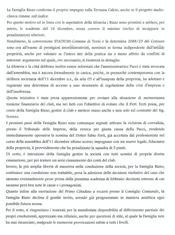 Alla fine, dopo tensioni e paure, la famiglia Rizzo rispetterà gli impegni presi e continuerà ad onorare quegli impegni che la scadenza federale del 16 dicembre impone. Lo aveva fatto capire la presidente Claudia Rizzo, nel corso della conferenza stampa odierna tenuta insieme al capitano Capuano, e lo ha ribadito la stessa famiglia Rizzo attraverso un comunicato dell’avvocato Manlio Morcella. Un comunicato in cui vengono precisate e ribadite alcune esigenze che devono essere rispettate come quella di una gestione autonoma attraverso professionisti di cui si avvarranno i Rizzo. Del resto rispettare gli impegni che richiedono un altro sforzo non indifferente sul piano economico impone che a gestire direttamente la società non siano coloro che hanno perso la fiducia degli attuali proprietari della Ternana calcio. Di seguito il comunicato dello studio Morcella diramato per conto della famiglia Rizzo.