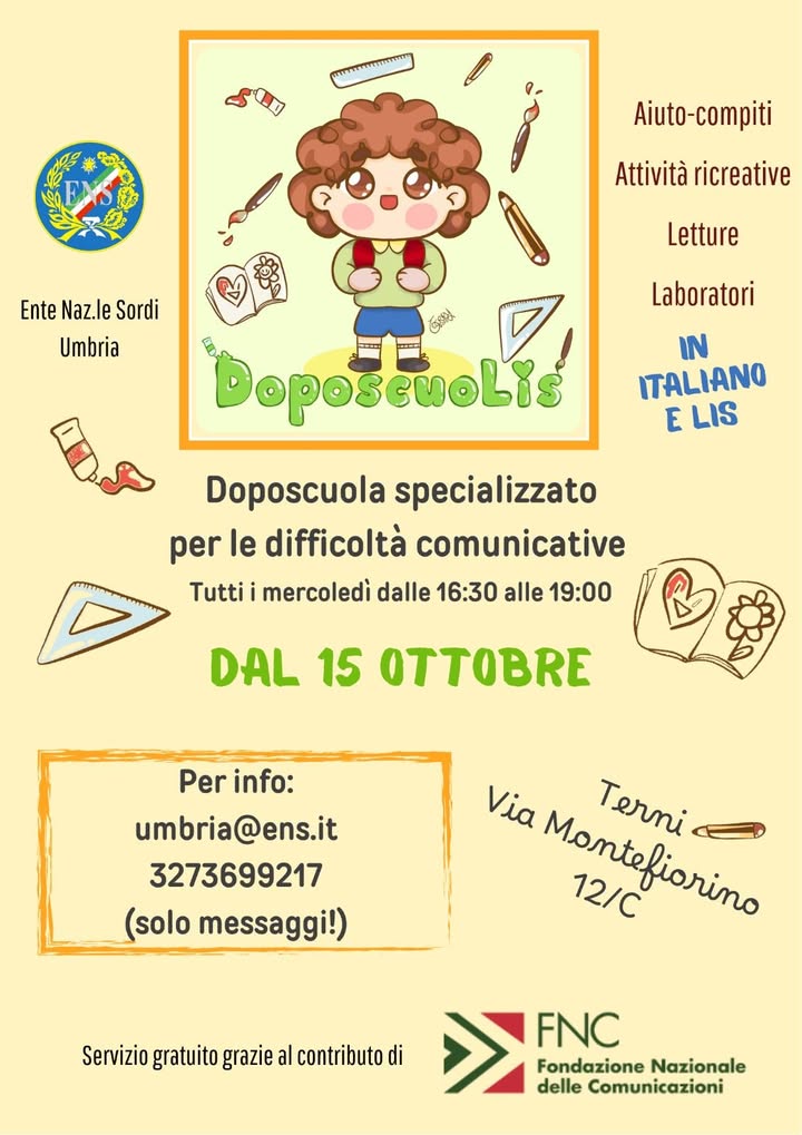 Rivolto a bambini e ragazzi residenti in Umbria, il servizio sarà aperto a tutti, ma con priorità per studenti sordi o con specifici bisogni comunicativi. Le attività proposte includeranno aiuto compiti, laboratori, letture in italiano e in LIS (Lingua dei Segni Italiana), oltre a momenti ricreativi.