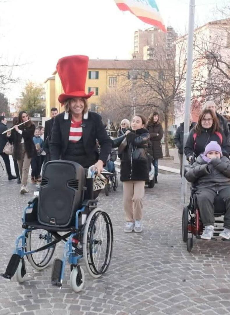 Il pifferaio magico ha condotto la parata narrando una fiaba sul tema della disabilità, accompagnato da musicisti e danzatori, sospingendo una sedia a rotelle vuota, la poltrona in prima fila, appunto, su cui a turno ciascuno ha potuto sedersi e prendere parte all’evento da spettatore privilegiato, in prima fila.