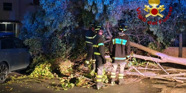Le immagini si riferiscono ad un albero abbattuto da una raffica di vento in viale Di Vittorio la cui chioma è finita su un’auto parcheggiata.