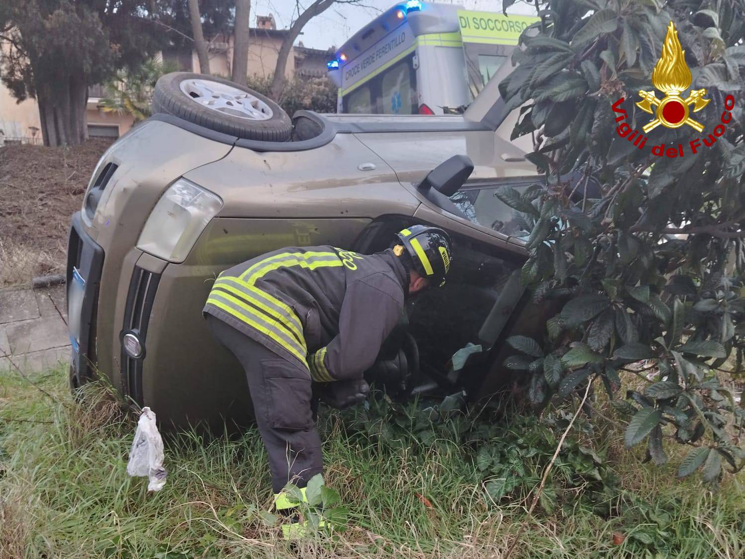 A bordo dell’auto, il conducente e il suo cane. Per estrarli entrambi dall’abitacolo sono dovuti intervenire i vigili del fuoco.