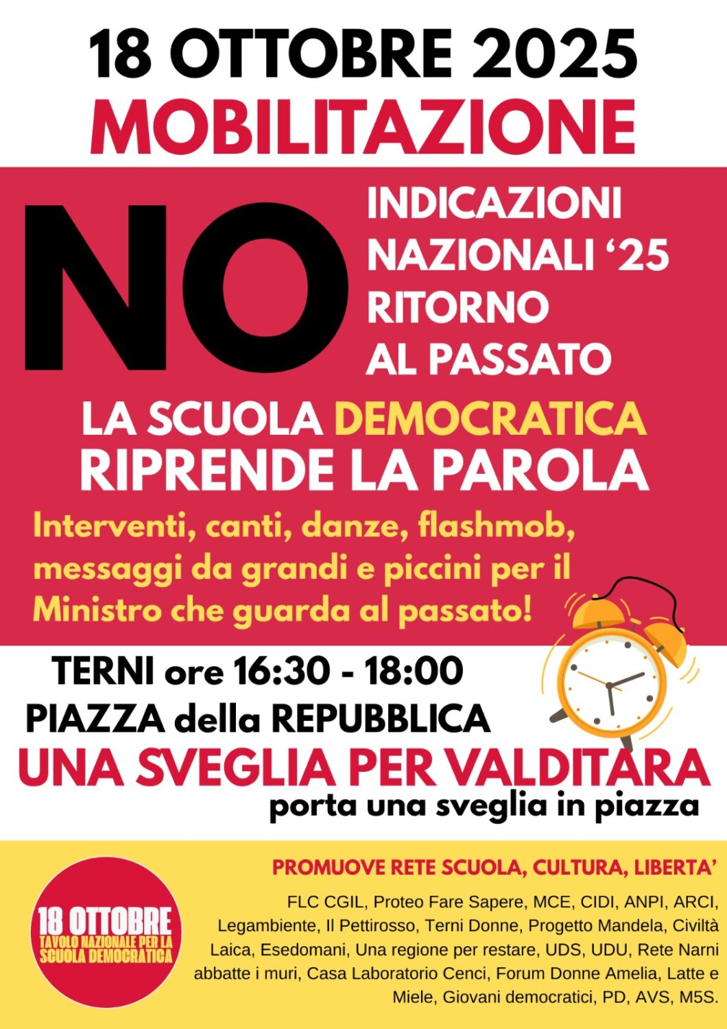 La Rete Scuola Cultura Libertà aderisce alla mobilitazione nazionale promossa dal Tavolo Nazionale per la Scuola Democratica e invita insegnanti, studenti, genitori e cittadinə a partecipare alla manifestazione “Una sveglia per Valditara”, che si terrà sabato 18 ottobre a Terni, in contemporanea con molte altre piazze italiane. L’iniziativa nasce per contrastare l’approvazione delle nuove Indicazioni nazionali 2025 per il primo ciclo, che rappresentano — secondo la rete promotrice — una profonda regressione culturale e pedagogica. Dietro la retorica “dell’innovazione”, le nuove Indicazioni ripropongono un modello di scuola trasmissiva, selettiva e autoritaria, centrato sull’obbedienza e sull’identità nazionale come valore esclusivo, riducendo l’autonomia professionale dei docenti e cancellando parole fondamentali come intercultura, partecipazione, complessità, sostenibilità e uguaglianza di genere. “La scuola pubblica è un bene comune, un presidio di democrazia, uguaglianza e libertà – dichiara la portavoce della Rete Scuola Cultura Libertà –. Le nuove Indicazioni rischiano di cancellare anni di ricerca pedagogica e di pratica educativa, riportando la scuola indietro nel tempo. Noi chiediamo una scuola che educhi al pensiero critico, alla cittadinanza, alla solidarietà e al rispetto delle differenze, una scuola che costruisca il futuro, non che lo tema.” Durante la manifestazione si alterneranno interventi, letture, musica e momenti collettivi di partecipazione, in collegamento con le piazze di tutta Italia. Alle ore 18:00, tuttə insieme, i partecipanti faranno suonare le proprie sveglie per ricordare al ministro Valditara che non siamo più nel passato e che la scuola italiana guarda al futuro, ai diritti e alla Costituzione. La Rete Scuola Cultura Libertà riunisce associazioni, docenti e cittadini impegnati nella difesa della scuola pubblica, inclusiva e democratica, convinti che solo un’istruzione libera e partecipata possa formare cittadine e cittadini consapevoli, capaci di affrontare la complessità del presente.